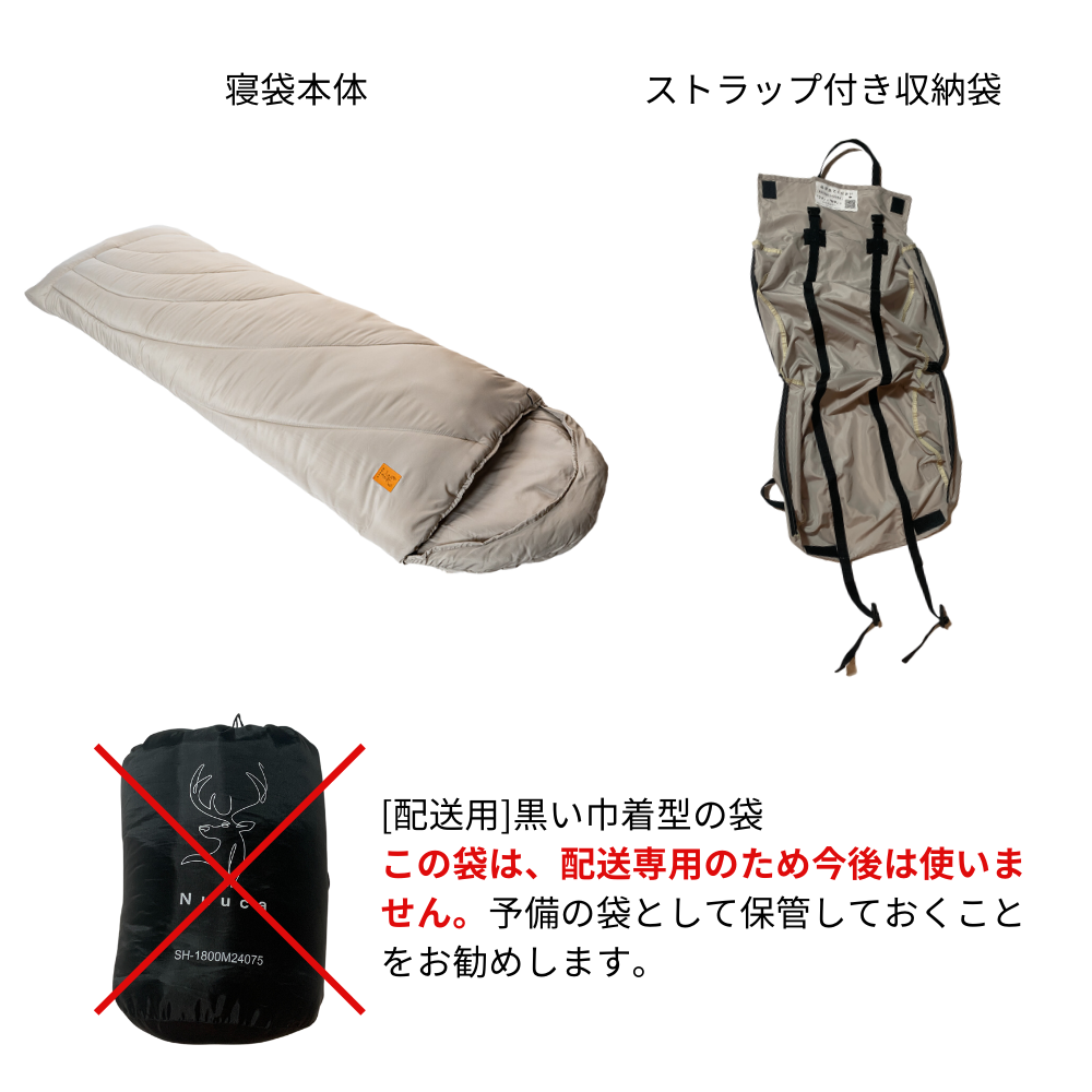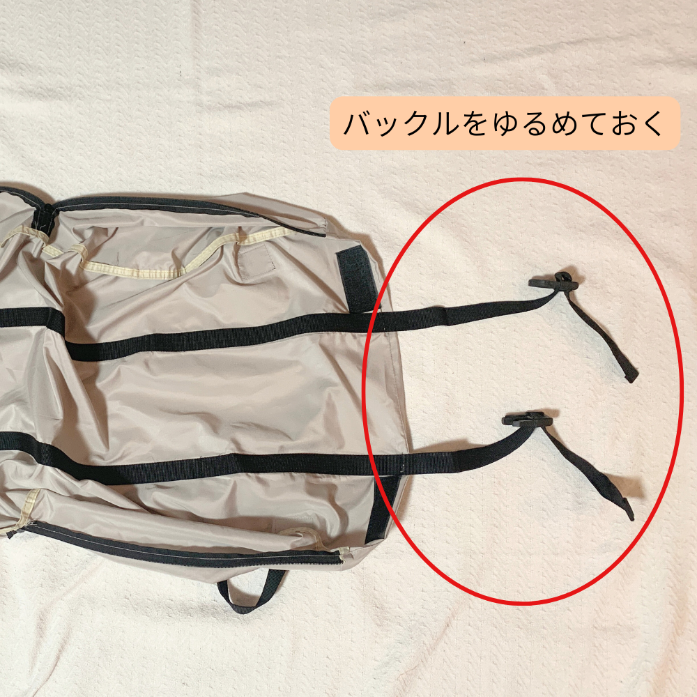 収納袋のストラップについているバックルを緩めて寝袋本体から離しておきます