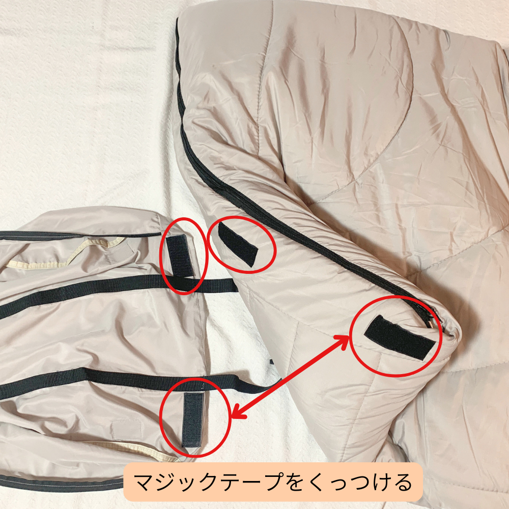 寝袋の下側の足元付近についているマジックテープと、収納袋のマジックテープをくっつけます