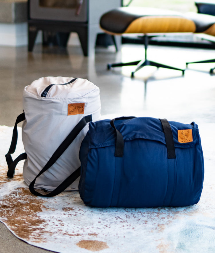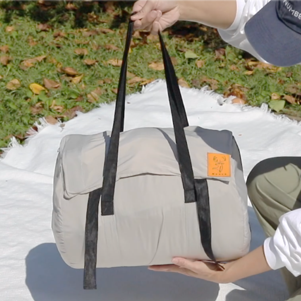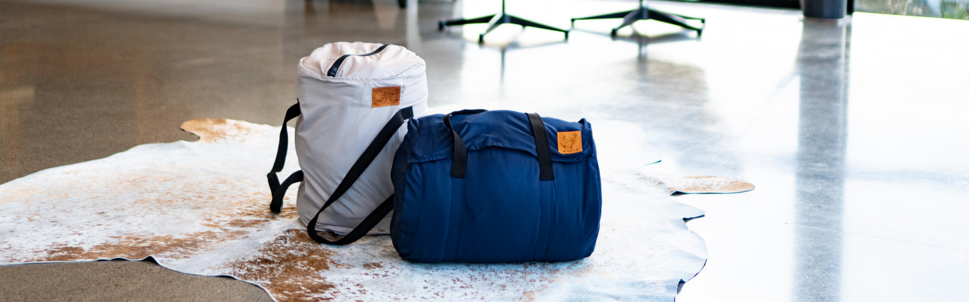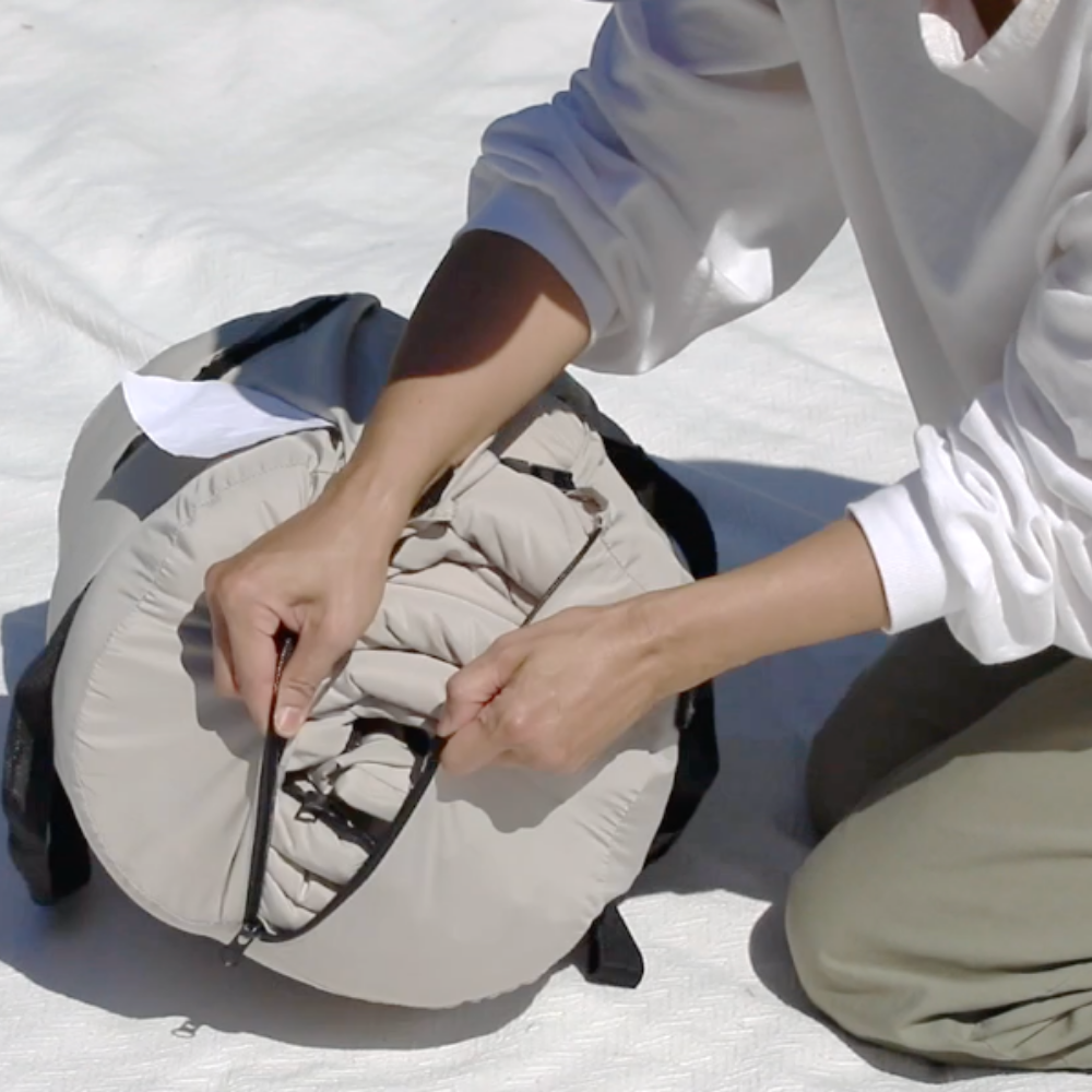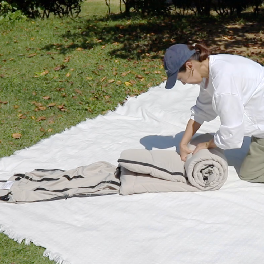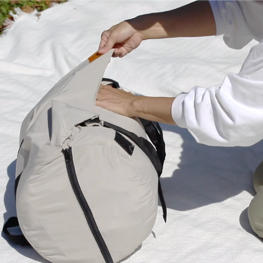 寝袋を縦に二つ折りにして、できるだけ空気を抜きながら丸めます。