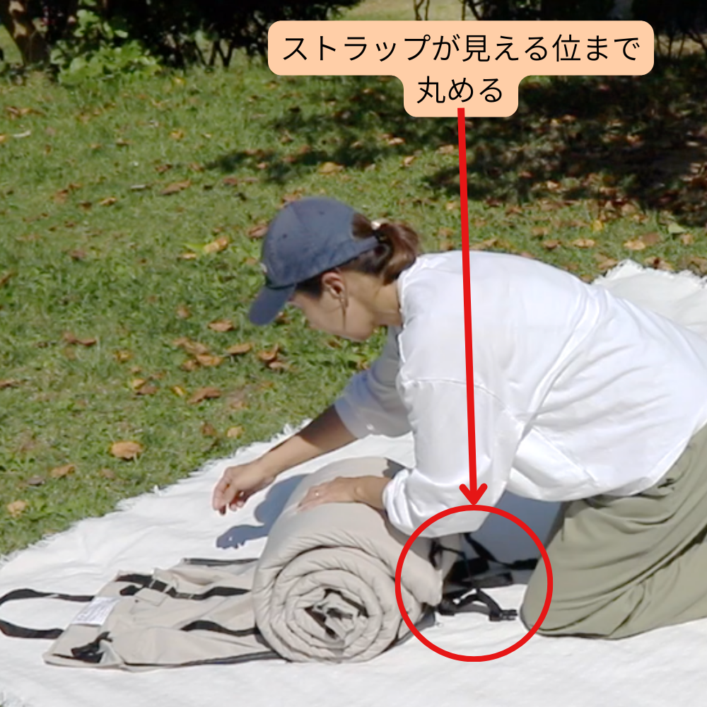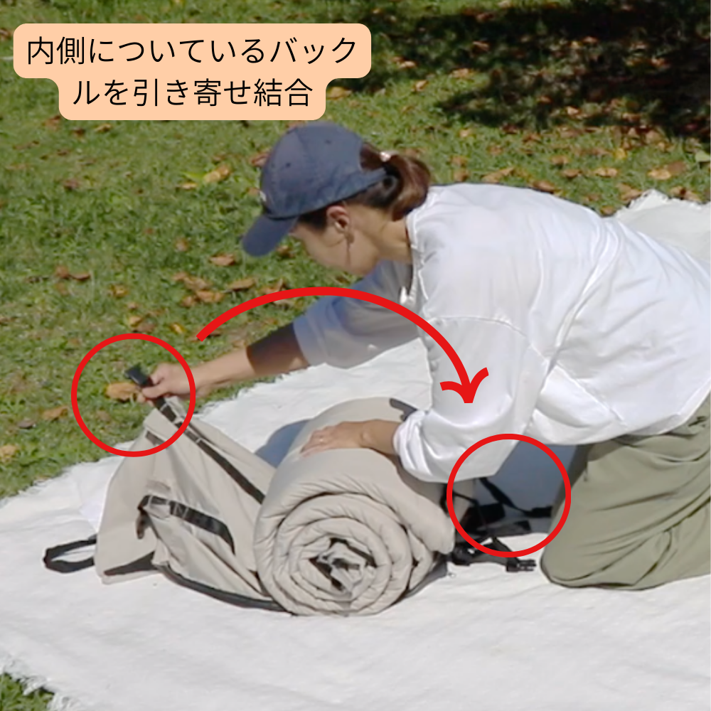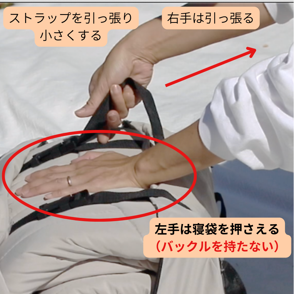 左手で丸めた寝袋をおさえてください(左手でバックルをもたないでください)。