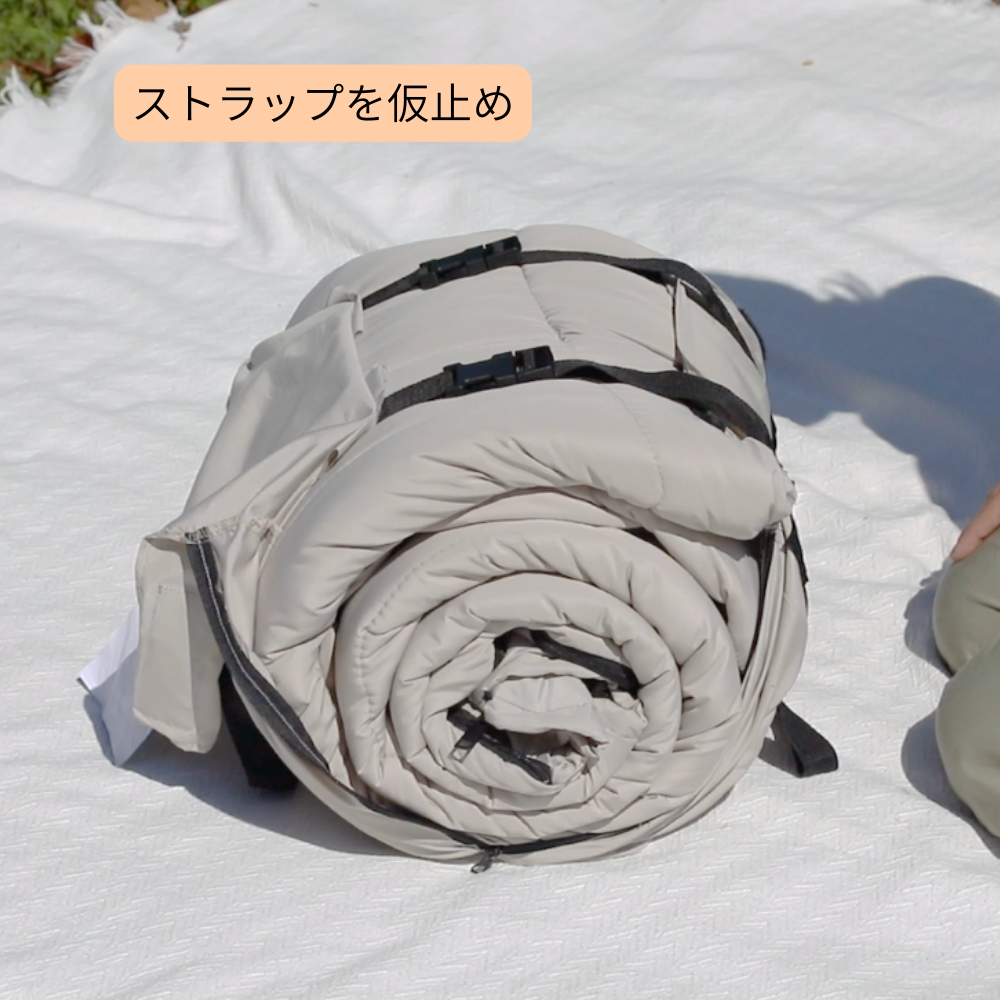 収納袋の内側に設置してある、ストラップを引き寄せ、手前のバックルと結合します(カチッとなるまで)