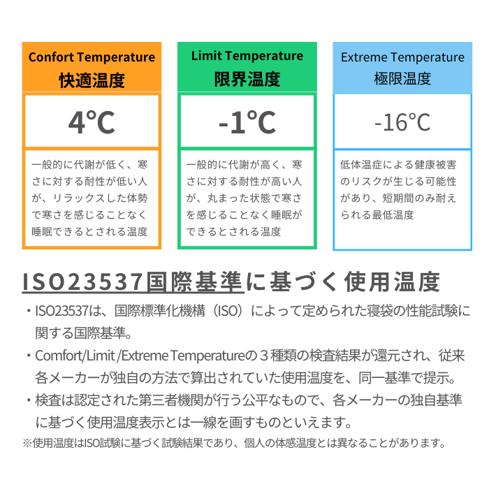 ※従来、使用温度は、保温性試験(JIS L1096 A法)にて測定したclo値に基づき算出しておりましたが、ISO国際基準に切り替えいたしました。